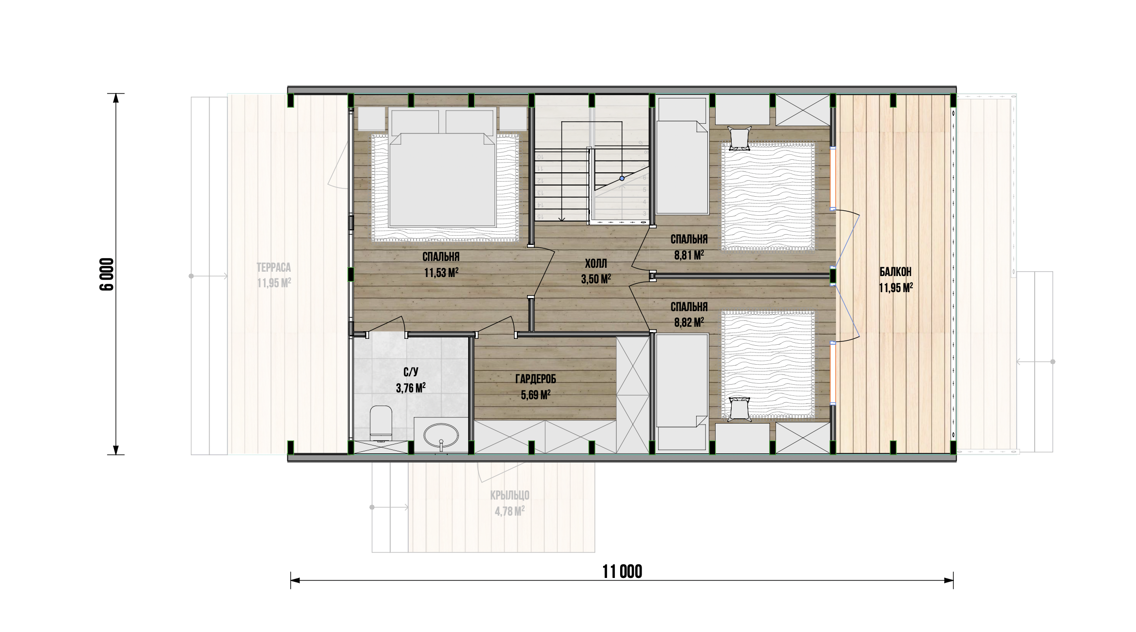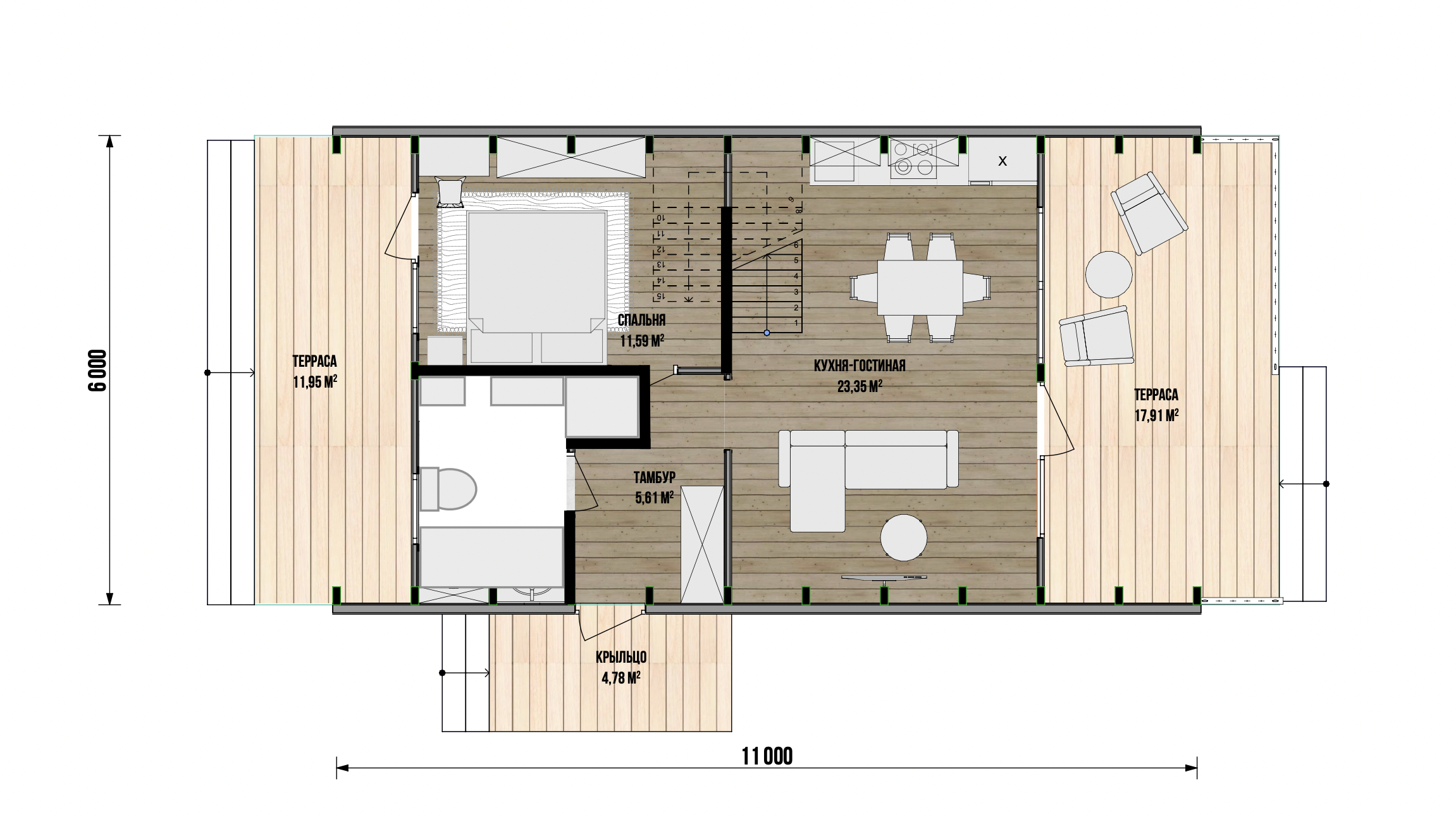 В доме имеется своя терраса 12 м2 на первом этаже для комнаты, которая может быть кабинетом, комнатой для гостей или родителей.
